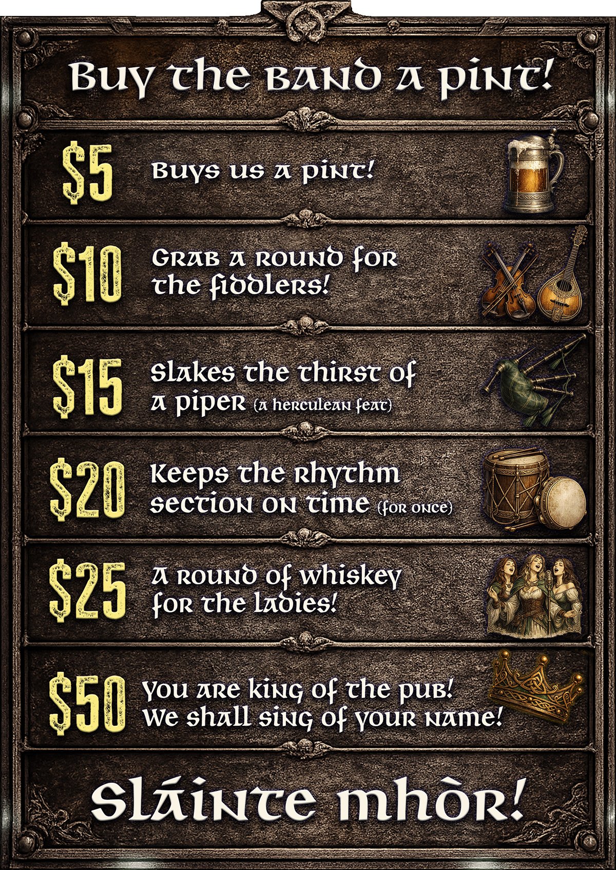Thank you so much for your support! Your generosity helps keep strings on our fiddles, reeds in our pipes, and beers in our hands!!!